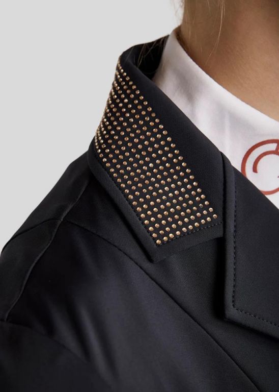 Mejora tu competitividad con la nueva y espectacular chaqueta de competición Montar, diseñada para combinar la sofisticación clásica con el glamour contemporáneo. Esta chaqueta es una auténtica pieza clave para el jinete que exige excelencia tanto en rendimiento como en estilo. La chaqueta luce exquisitos cristales oro rosa estratégicamente colocados para realzar su elegante diseño.