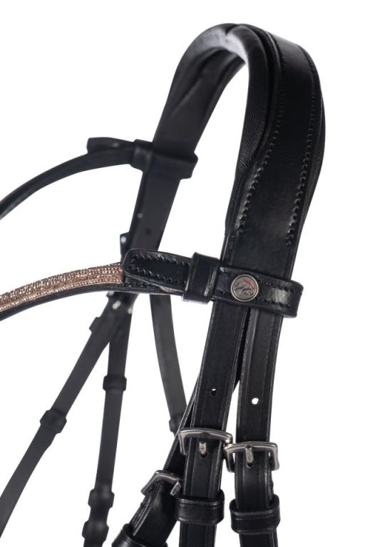 protección contra rozadurascon hebillas para desviar la cintacuero de alta calidadforro suavecorrea ajustable por ambos ladosprotector barbilla acolchadoriendas unidas con topes de cuerofrontalera fácil de quitar, con botonesmuserola sueca