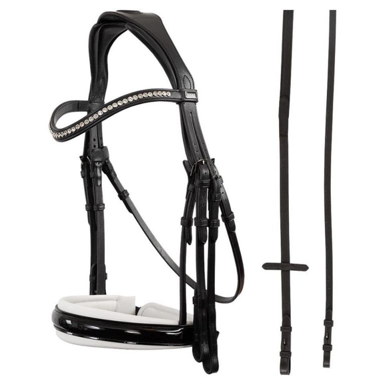 Testera anatómica que alivia la presión sobre los nervios sensibles• Muserola acolchada extra suave para una comodidad óptima• Diseño elegante con piedras Stellux™ y charolINFORMACIÓN DEL PRODUCTODescripción:¿Están usted y su caballo listos para montar con una brida Weymouth? Esta brida anatómica, hecha de cuero inglés de alta calidad, se mantiene hermosa durante mucho tiempo, se ajusta perfectamente a la cabeza del caballo y ofrece todas las comodidades.Características del producto:Tanto la testera como la muserola están suavemente acolchadas para una comodidad óptima y una buena distribución de la presión. La muserola contiene 10 mm de acolchado y está recubierta de charol en su exterior. Las hebillas de color bronce tienen una solapa protectora en el punto de contacto con la cabeza del caballo. La frontalera, ligeramente curvada, presenta una elegante incrustación de brillantes diamantes de imitación Stellux™ en robustas copas plateadas. Incluye riendas de cuero y goma.