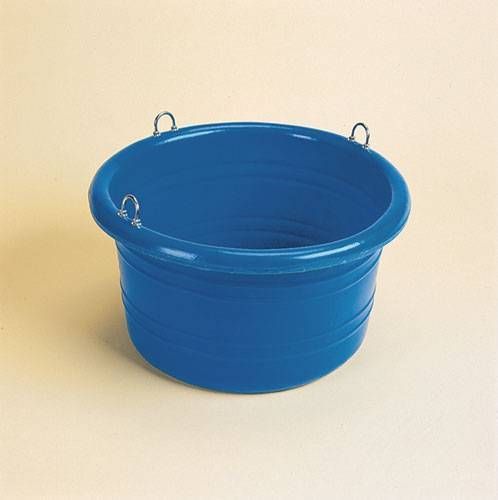 Estilo americano, comedero robusto fabricado con un plástico muy resistente.Se le puede acoplar el aro anti-pérdida metálico S44AWR (se comercializa por separado).Se puede fijar a una esquina de la cuadra usando el mosquetón con placa STUBBS S85PS (no incluido).Capacidad 35 litros.Dimensiones 49x31 cm.Colores: azul, negro y rojo.