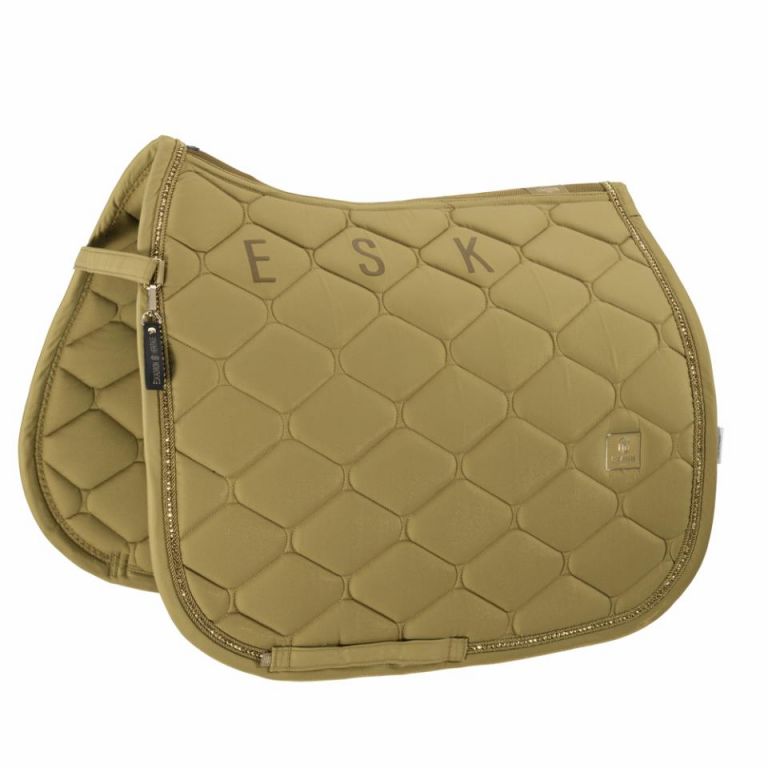 Superficie glam, interior fresco y secoAcolchado voluminosoSuperficies antideslizantes de silicona en la zona del sillínCombinación de cordón-cristal-cordón en el ribete glamCanal trasero de malla para la circulación del aireSistema innostrapCincha con triple posibilidad de cierreEmblema Heritage en ambos ladosCon llavero Eskadron