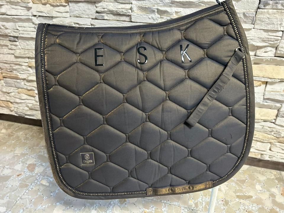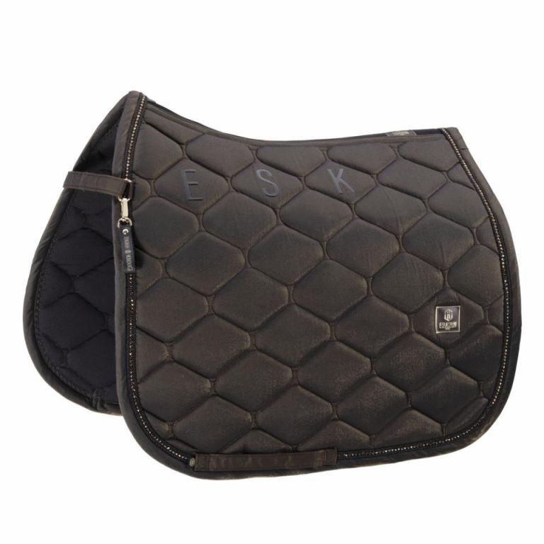Superficie glam, interior fresco y secoAcolchado voluminosoSuperficies antideslizantes de silicona en la zona del sillínCombinación de cordón-cristal-cordón en el ribete glamCanal trasero de malla para la circulación del aireSistema innostrapCincha con triple posibilidad de cierreEmblema Heritage en ambos ladosCon llavero Eskadron