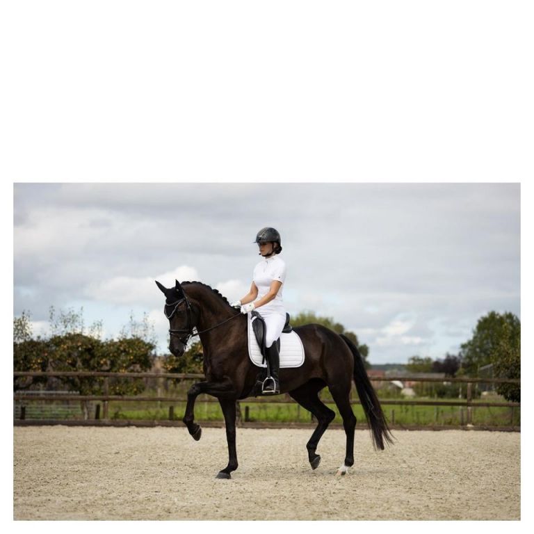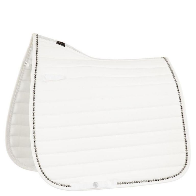 La mantilla tiene un relleno que absorbe los golpes y está decorada con elegantes tachuelas. Cuenta con cinchas y correas de retención con cierres de velcro.