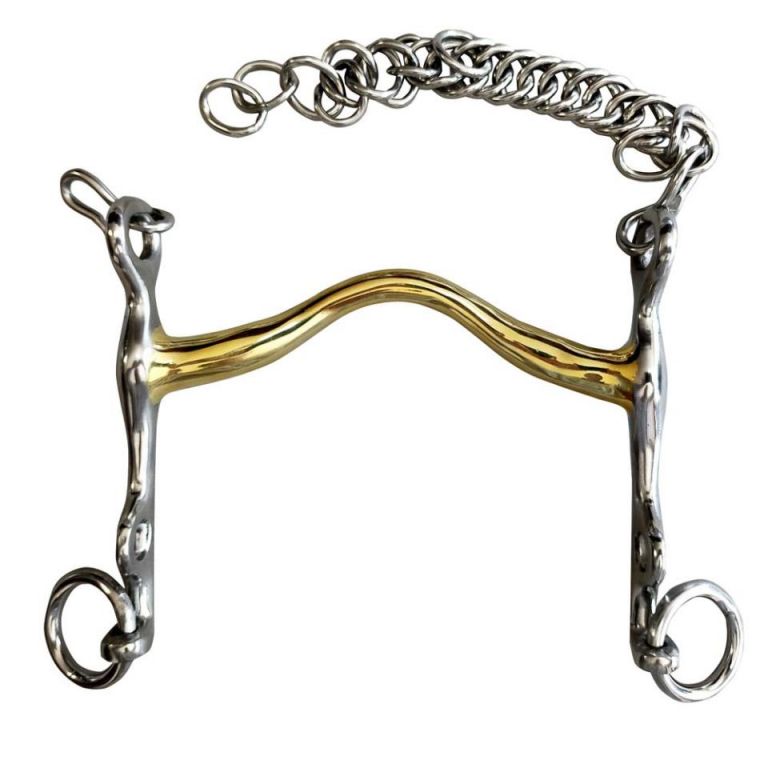 Embocadura dorada.Acero inoxidable.Con barbada.Esta embocadura se adapta fácilmente al arco sensible del paladar del caballo y proporciona mayor aceptación, evitando el impulso de poner la lengua sobre el bocado.Ideal para caballos de boca sensible, con lengua carnosa.Pierna: 7.5 cmPortamozos: 4.5 cmGrosor: 16 mmMedida: 12.5 cm - 13.5 cm