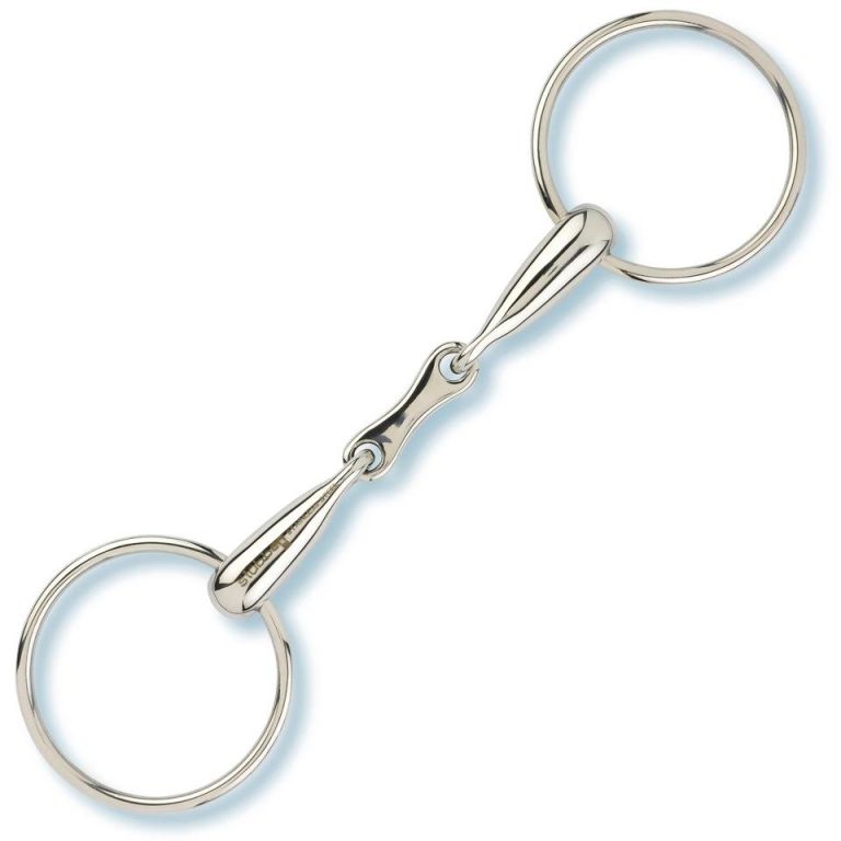 Anchos en cm: 12,5 / 13,5 / 14,5 cm. Anchos en pulgadas: 5” / 5 1/4” / 5 3/4”. Grosor: 20 mm, hueco. Bocado de filete de doble articulación con anillas sueltas. Su agradable forma favorece la aceptación y la masticación.