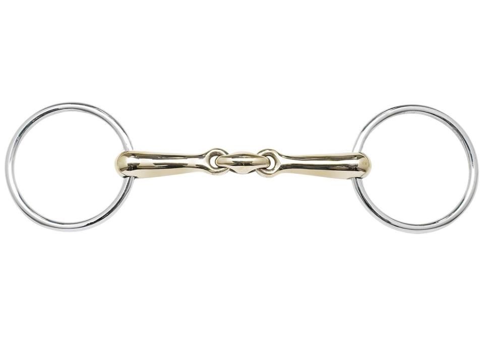embocadura Kaugan® maciza y pesada, muy bien elaboradade doble articulación con pieza de unión elípticainoxidable, con anillas de acero inoxidable