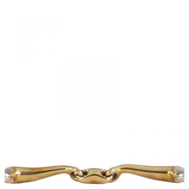 Filete hecho de Cuprigan sólido con anillos de acero inoxidable. Cuprigan es una aleación que consta de 89% de cobre, 7% de aluminio, 3% de hierro y 1% de zinc. El proceso de oxidación del material proporciona un agradable olor y sabor. El diseño anatómico de la broca sigue la forma de la boca del caballo, lo que permite una distribución suave y uniforme de la presión. La forma ligeramente curvada de la boquilla garantiza un poco más de espacio para los lados de la lengua. El diseño, combinado con las propiedades únicas de Cuprigan, fomenta el proceso de masticación y la producción de saliva, lo que permite una conexión agradable con la sensible boca del caballo. La broca aplica una presión leve en la boca. Boquilla espesor 14 mm, tamaño del anillo 65 mm.