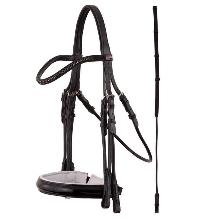 Forma anatómica.con forro acolchado blando.Frontalera ligeramente curvada con una cadena de plata y diamantes de imitación.Con accesorios de acero inoxidable.La cabezada se suministra con las riendas de doma clásica de cuero (16 mm) con goma.