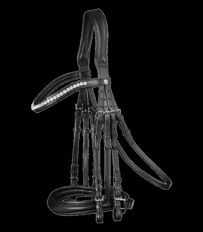 Cabezada sueca de montar- Cuero muy suave- Testera anatómica- Frontalera redondeada con piedras estrás grandes y claras- Muserola, frontalera y testera con suave revestimiento- Hebillas de acero inoxidable- Riendas para bocado de cuero de 12 mm, riendas para brida de 16 mm.