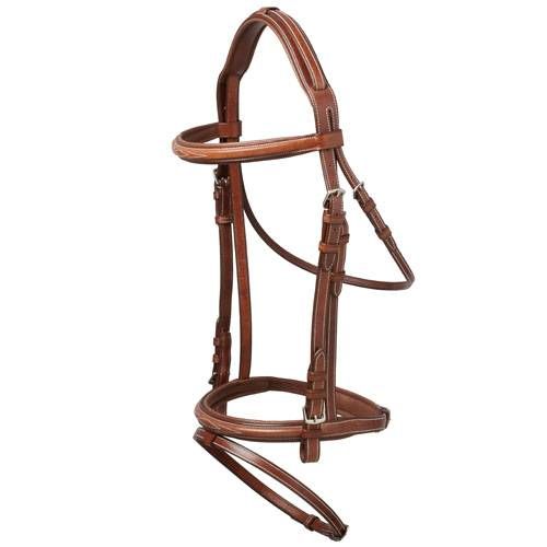 Cabezada para filete. No incluye riendas. Testera acolchada con montante de muserola por el exterior para un mayor confort del caballo. Muserola fina acolchada con cierrabocas y pieza acolchada trasera para protección. Realizada íntegramente con cuero vegetal de primera calidad procedente de USA y curtido de forma ECOLÓGICA también en USA. Hebillaje de acero inoxidable.
