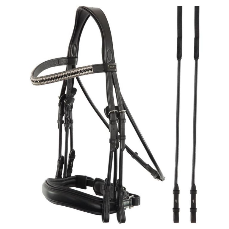 Esta cabezada de filete y bocado ANKY® está hecha de cuero inglés de alta calidad. La pieza para la cabeza con forma anatómica está acolchada suavemente con cuero y proporciona libertad adicional detrás de las orejas del caballo gracias a su forma redonda. La cabezada de cuero cilindrico tiene una banda ancha y curva adornada con cinco filas de brillantes diamantes de imitación. El ahogadero es ajustable con una hebilla en la parte inferior y las quijeras están equipadas con hebillas de gancho. La cabezada tiene una banda ancha para la manivela (aprox. 4,5 cm). La muserola de forma anatómica es redondeada, suave y acolchada y cuenta con una almohadilla ancha para la barbilla. La muserola ha sido especialmente diseñada para acomodar los pómulos y los nervios faciales sensibles del caballo. El diseño también reduce la presión sobre los dientes del caballo. La brida cuenta con herrajes de latón cromado brillante de color plateado y viene con riendas de cuero.