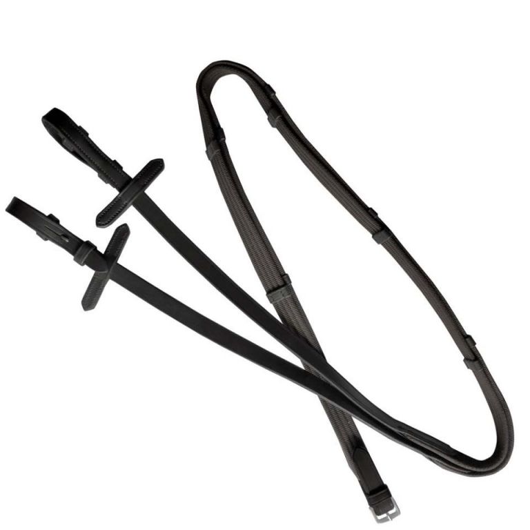 Riendas de lona con topes de cuero.Unidas por una hebilla cromada.Hebillaje de alubia cromado.Tamaño único.Medidas: 2 unidades X 140 cm (largo) x 2 cm (ancho)
