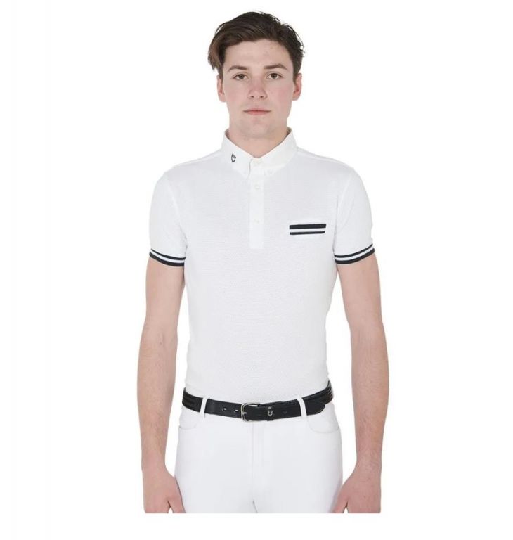 Camiseta polo de competición para hombre de corte slim en tejido técnico transpirable y elástico, que garantiza una comodidad óptima y la máxima libertad de movimiento.El polo es de manga corta con detalles en negro, también replicados en el borde del bolsillo lateral en el pecho.El cierre es con tres botones con cuello abotonado caracterizado por el bordado del logo Equestro en el lado derecho.