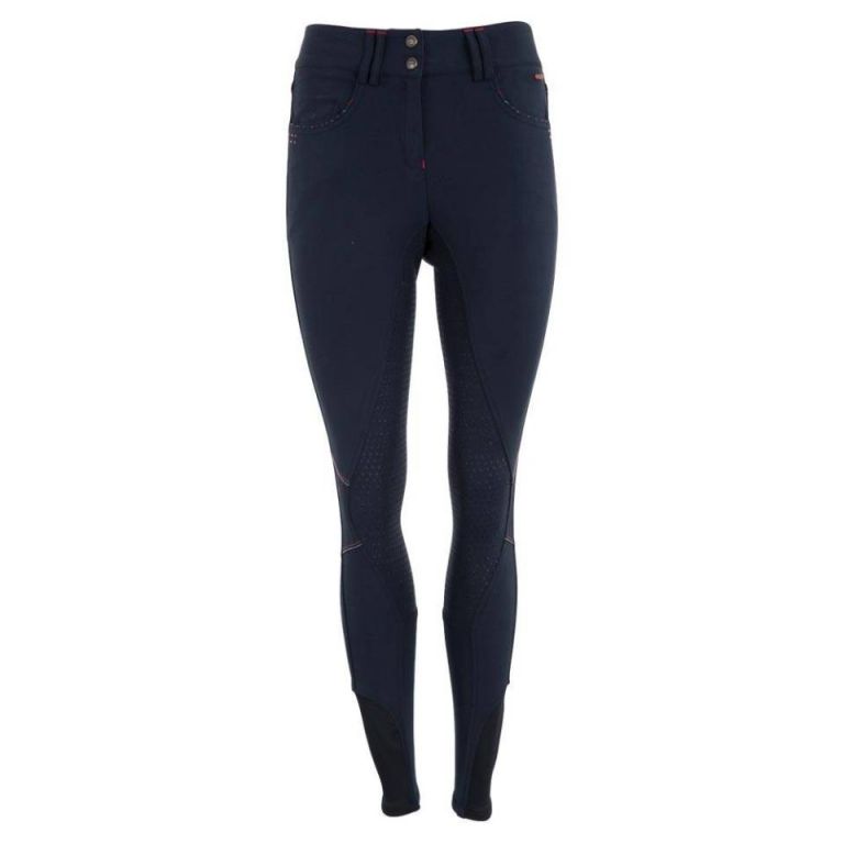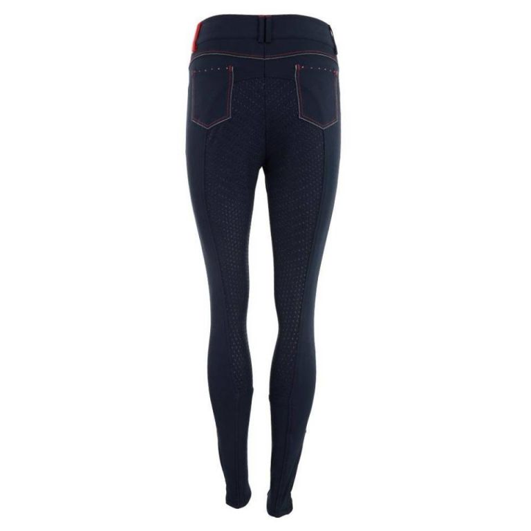 Pantalón de montar Premiere Foxglove de mujer, en color marino, con detalles en rojo y blanco, así como cristales decorativos en rosa en los bolsillos, con silicona full grip.Tiene dos bolsillos delanteros y dos traseros, siendo un pantalón que se ajusta a tu figura.