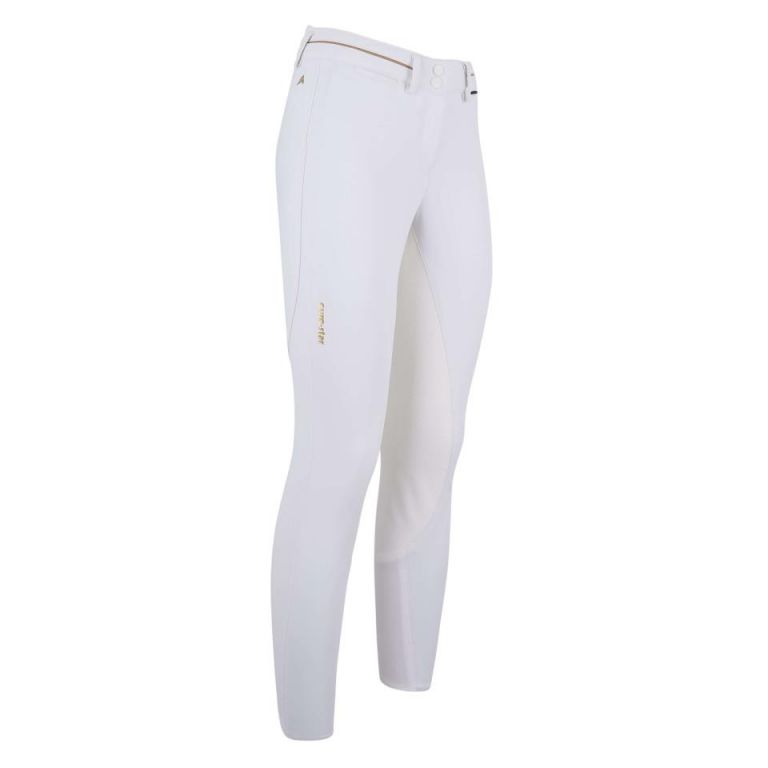 Super chic y con clase. Los pantalones para mujer Jigsaw KneeGrip Premium están hechos de tela funcional EQUIBELLE innovadora que se ha desarrollado específicamente para las necesidades de los jinetes. El estiramiento funcional de 4 vías hecho de tela Equibelle tiene un efecto positivo en la regulación térmica, debido a sus propiedades especiales. Asegura una temperatura corporal ideal y un equilibrio de oxígeno ideal, evita la sudoración, protege del enfriamiento y aumenta su nivel de libertad de movimiento. El uso de material Equibelletiene un efecto positivo en la elasticidad y firmeza de su piel. Estos pantalones cuentan conun asiento completo de silicona y una pretina elevada en la parte inferior de la espalda. Las costuras ergonómicas adaptadas a la anatomía femenina garantizan una excelente comodidad de uso. Se han aplicado pequeñas letras verticales euro-star en el lado externo del muslo superior derecho. La pretina presenta una franja decorativa horizontal.Centrado en la parte delantera hay un botón doble