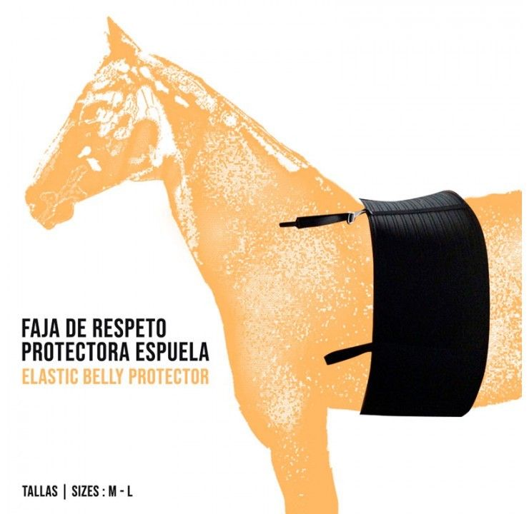 Está fabricada con una tela elástica de muy alta calidad que permite transpirar la piel del caballo y, por ello, la zona afectada con rozaduras se regenera y recupera las óptimas condiciones.A la altura del pie tiene un refuerzo que sirve para incrementar su durabilidad y reducir el desgaste por uso, ya que la zona está sujeta a una presión continua que el jinete ejerce con el talón.La faja de respeto está equipada con un enganche para el asiento y con un cierre de velcro. Las cuatro correas (dos en cada lado) permiten sujetarla a cualquier tipo de cincha.Color negro, disponible en las siguientes tallas:* Talla M: 205 cm. (Pecho desde 200 cm. hasta 219 cm.).* Talla L: 215 cm. (Pecho desde 220 cm. hasta 249 cm.).