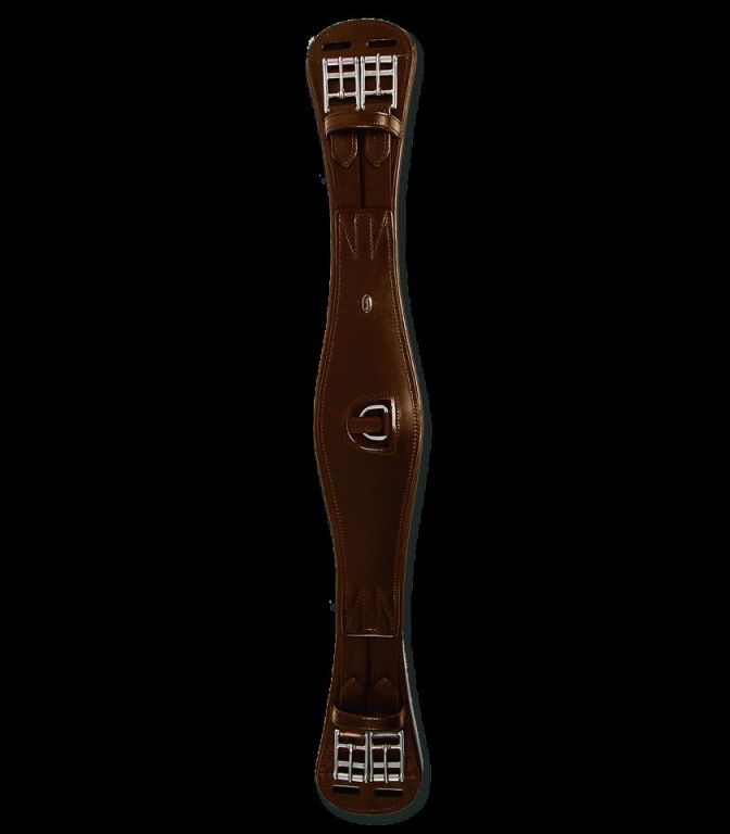 Cuero de excelente calidad y hechura. Con hebillas de rodillo de acero inoxidable, inserción elástica en ambos extremos y anilla central para la sujeción de riendas auxiliares. Las aberturas para las correas, realizadas en el cuero, impiden que la cincha se deslice debajo de las mismas correas.