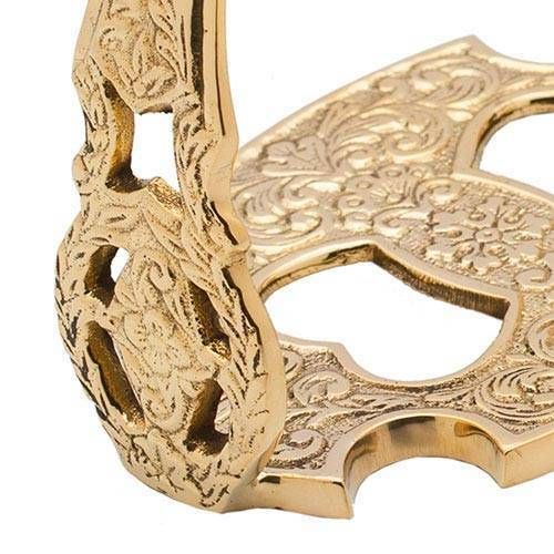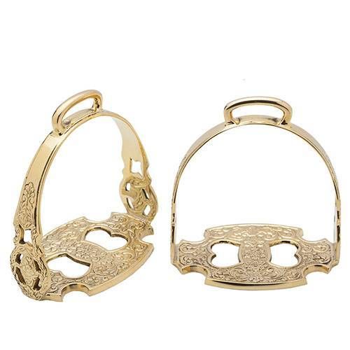 Estribos de estilo portugués con el labrado tradicional.Base un poco mayor de 12 cm.Disponible en color dorado y cromado.